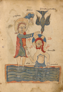 Baptism of Christ; black ink and watercolours on paper, 1386, anonymous